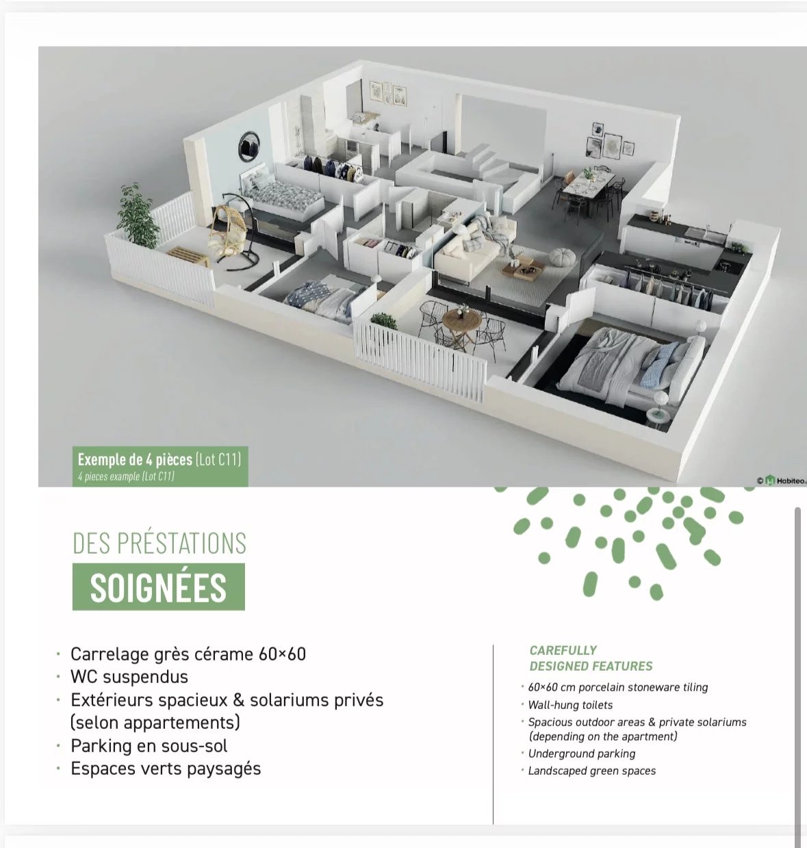 This intimate residence offers apartments designed to combine the comfort of a house with the advantages of apartment living. All units benefit from spacious outdoor areas (terraces or gardens) and a south-east exposure, ensuring optimal natural light throughout the day.