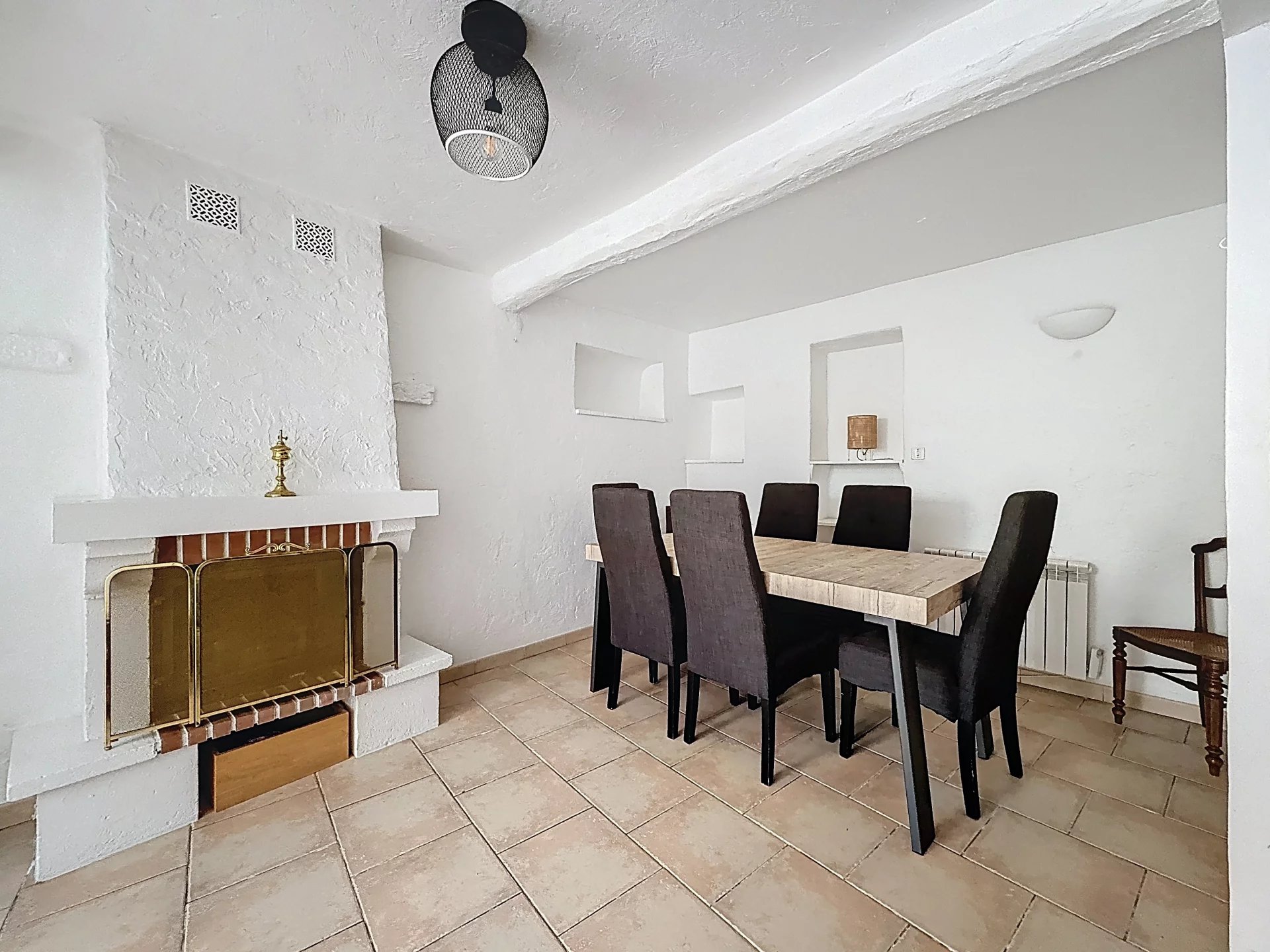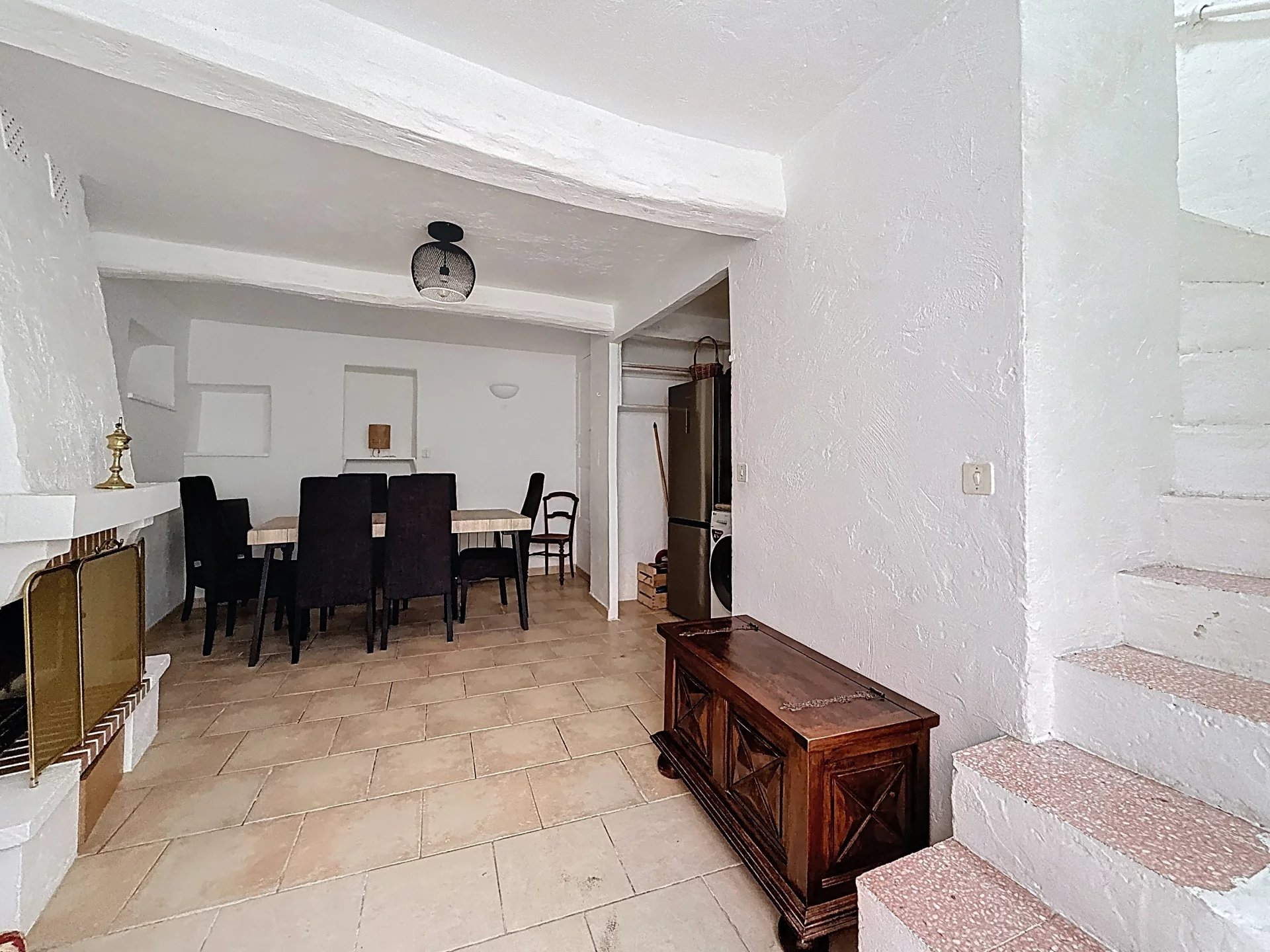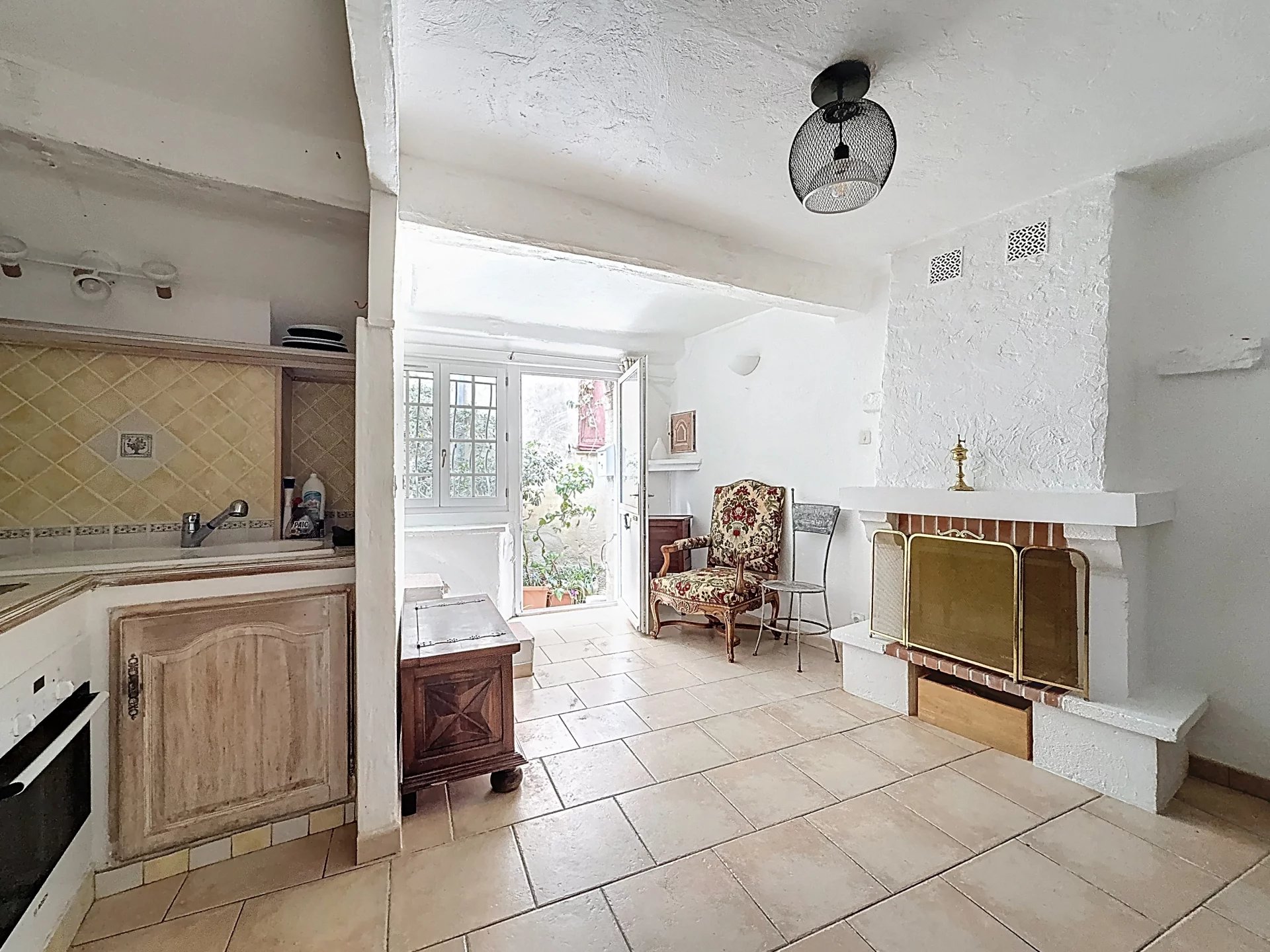 Au rez-de-chaussée : Un séjour avec cuisine ouverte et un espace salle à manger s'articulant autour d'une cheminée d'époque toujours fonctionnelle.