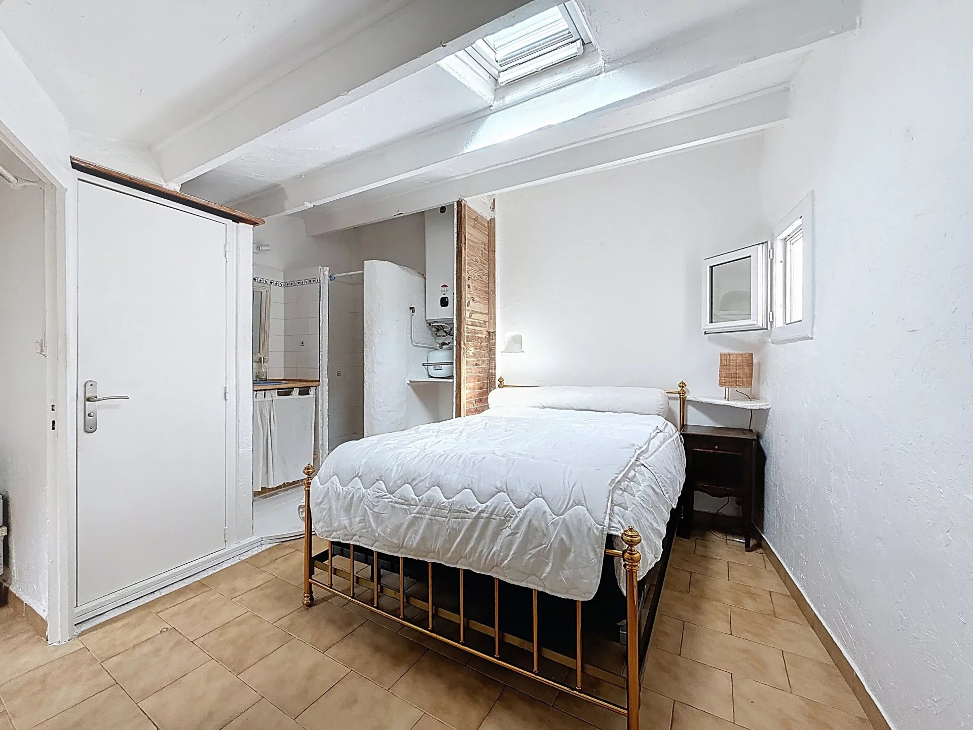 Au 1er étage : Une chambre avec pièce d'eau et rangements. L'espace est baigné de lumière grâce à plusieurs fenêtres et Velux.