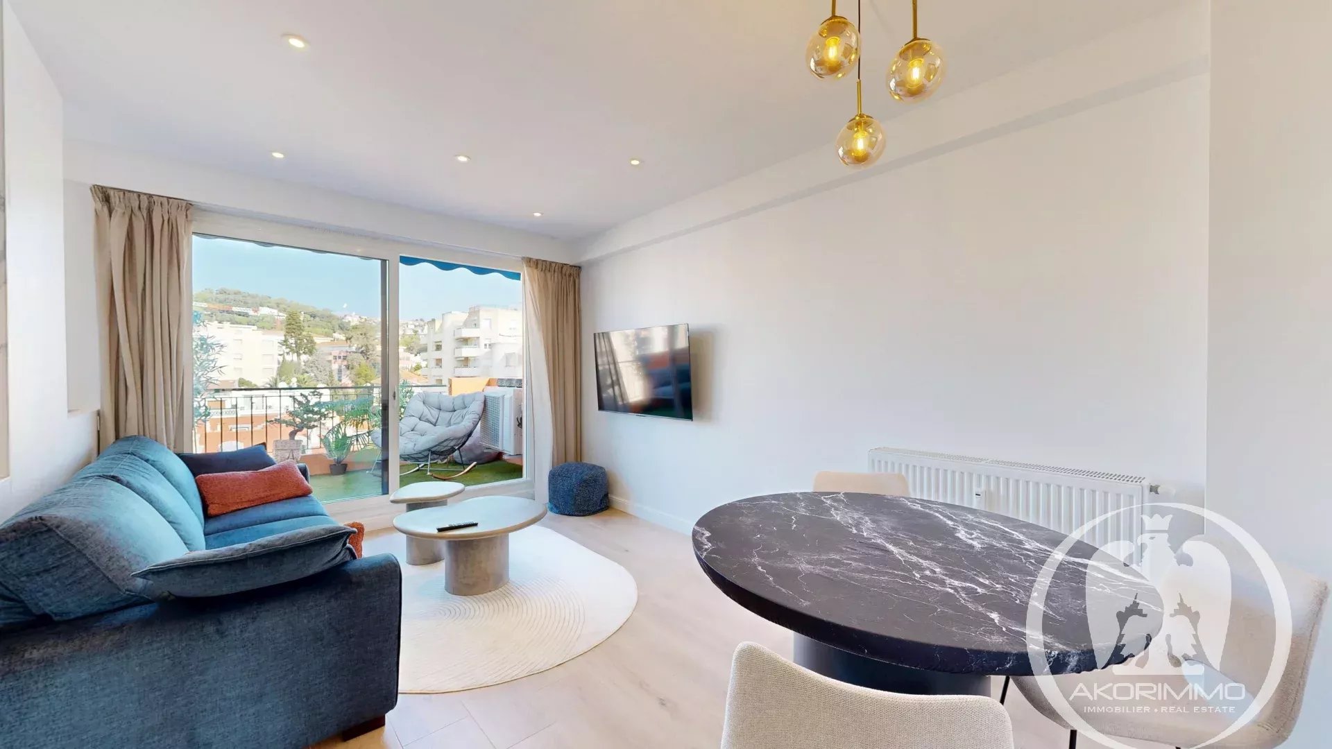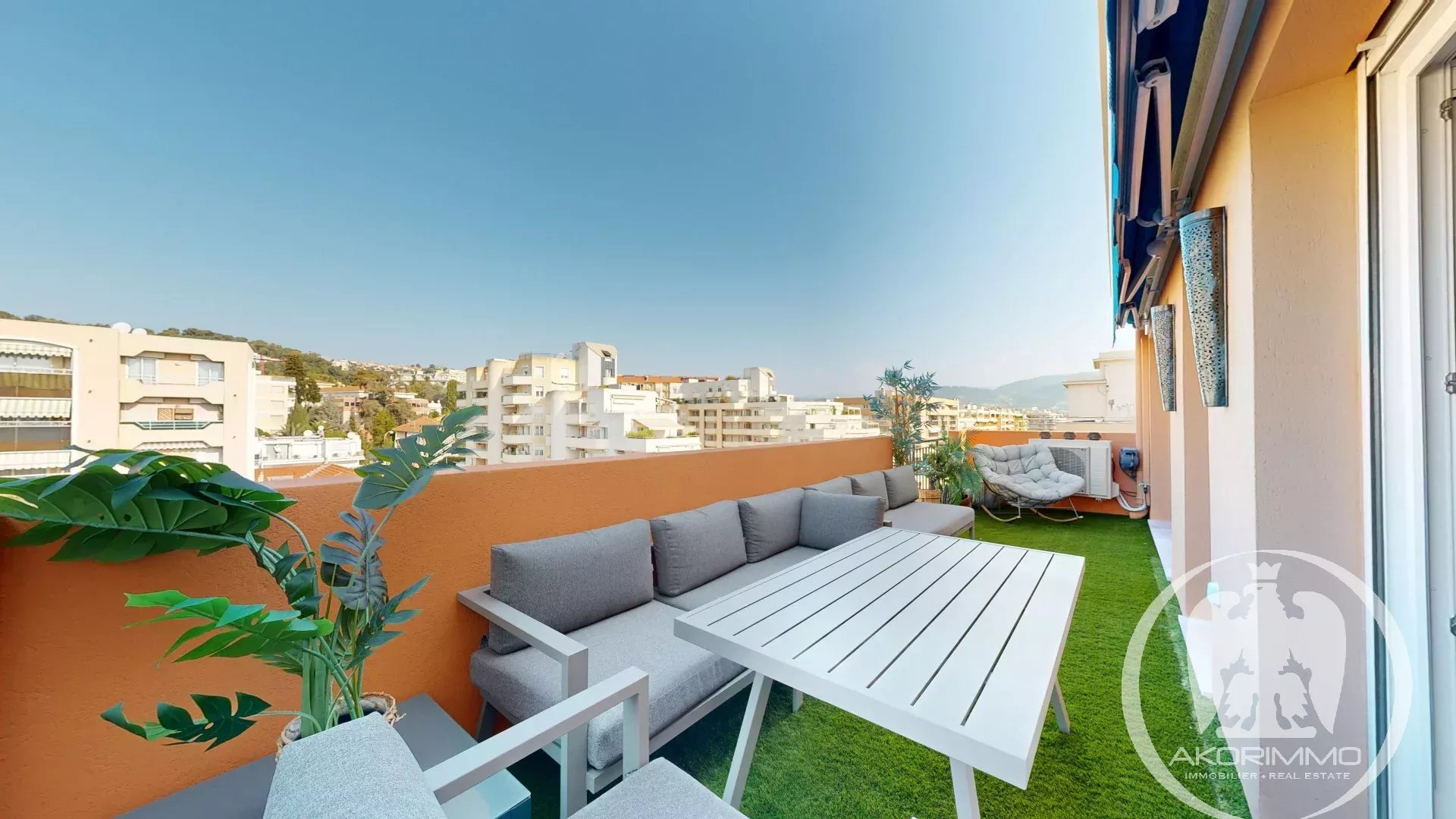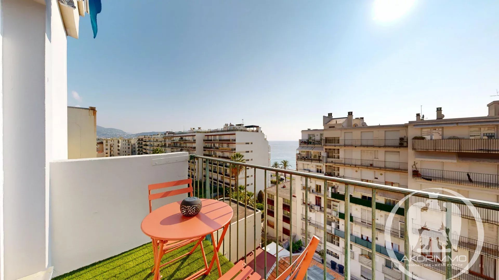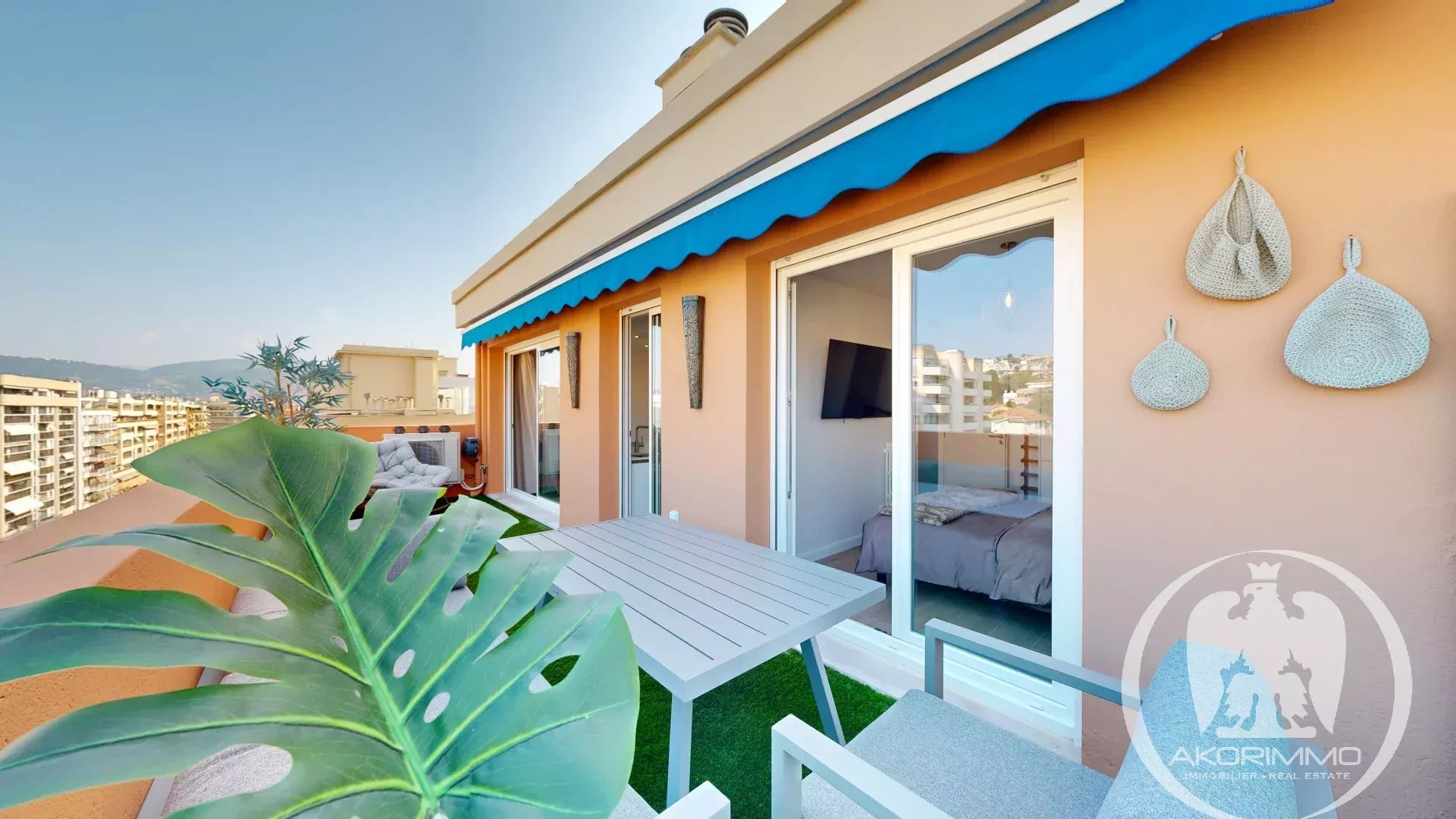 NICE - RUE DE FRANCE / PROMENADE : Dans une belle résidence bien tenue, MAGNIFIQUE 3 PIÈCES TRAVERSANT EN DERNIER ÉTAGE AVEC GRANDE TERRASSE DE 17 M² À CIEL OUVERT VUE DÉGAGÉE VILLE ET MER, vendu clé en main.