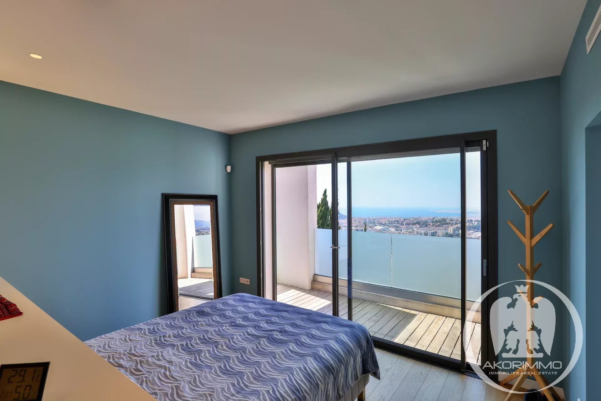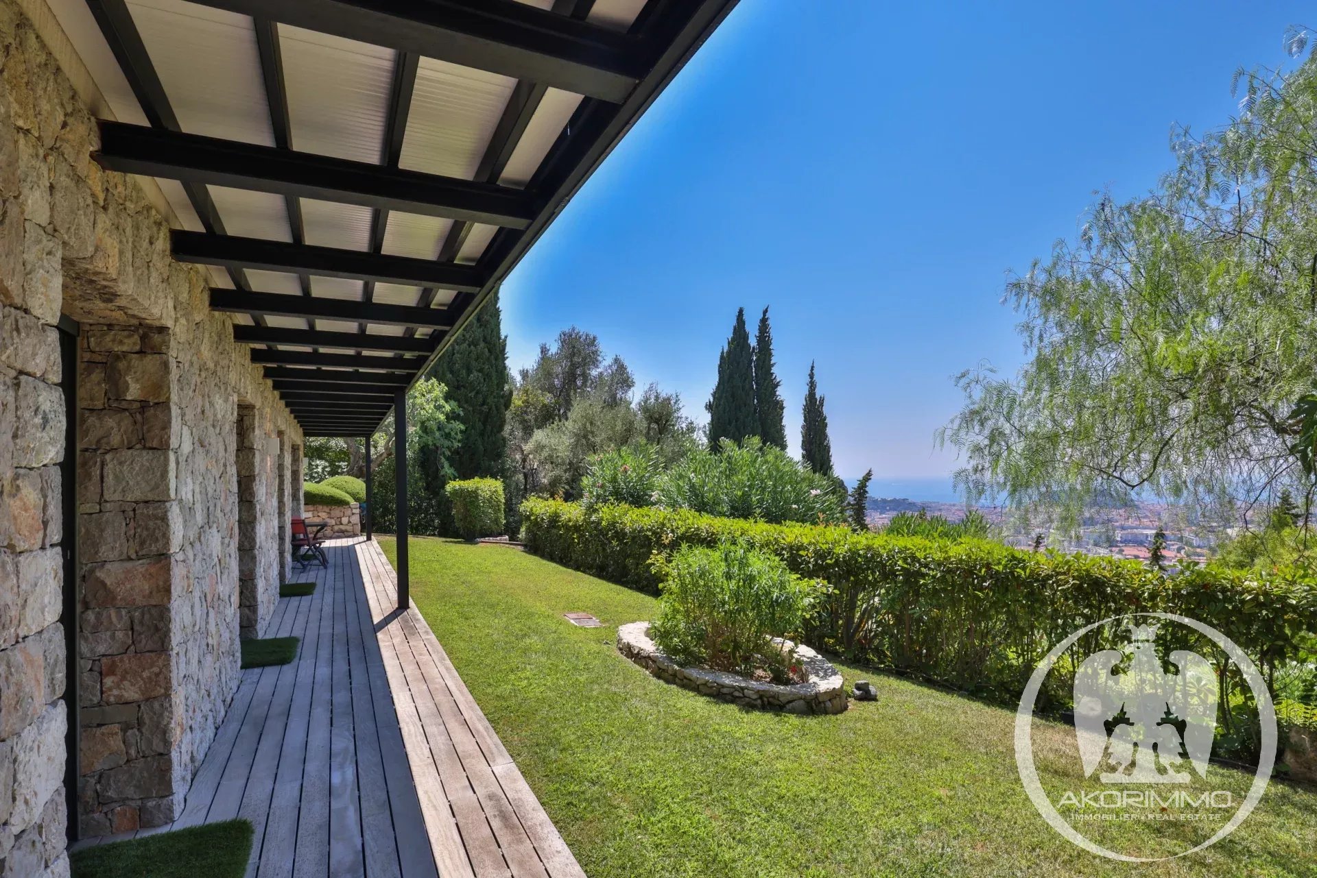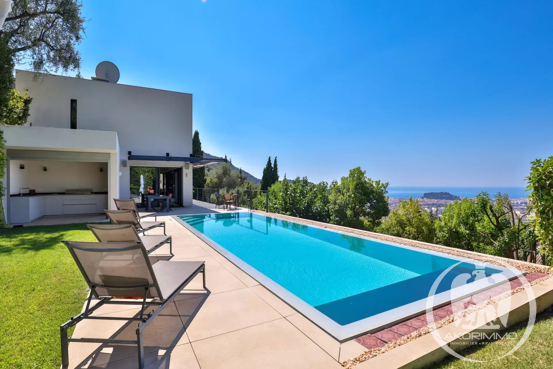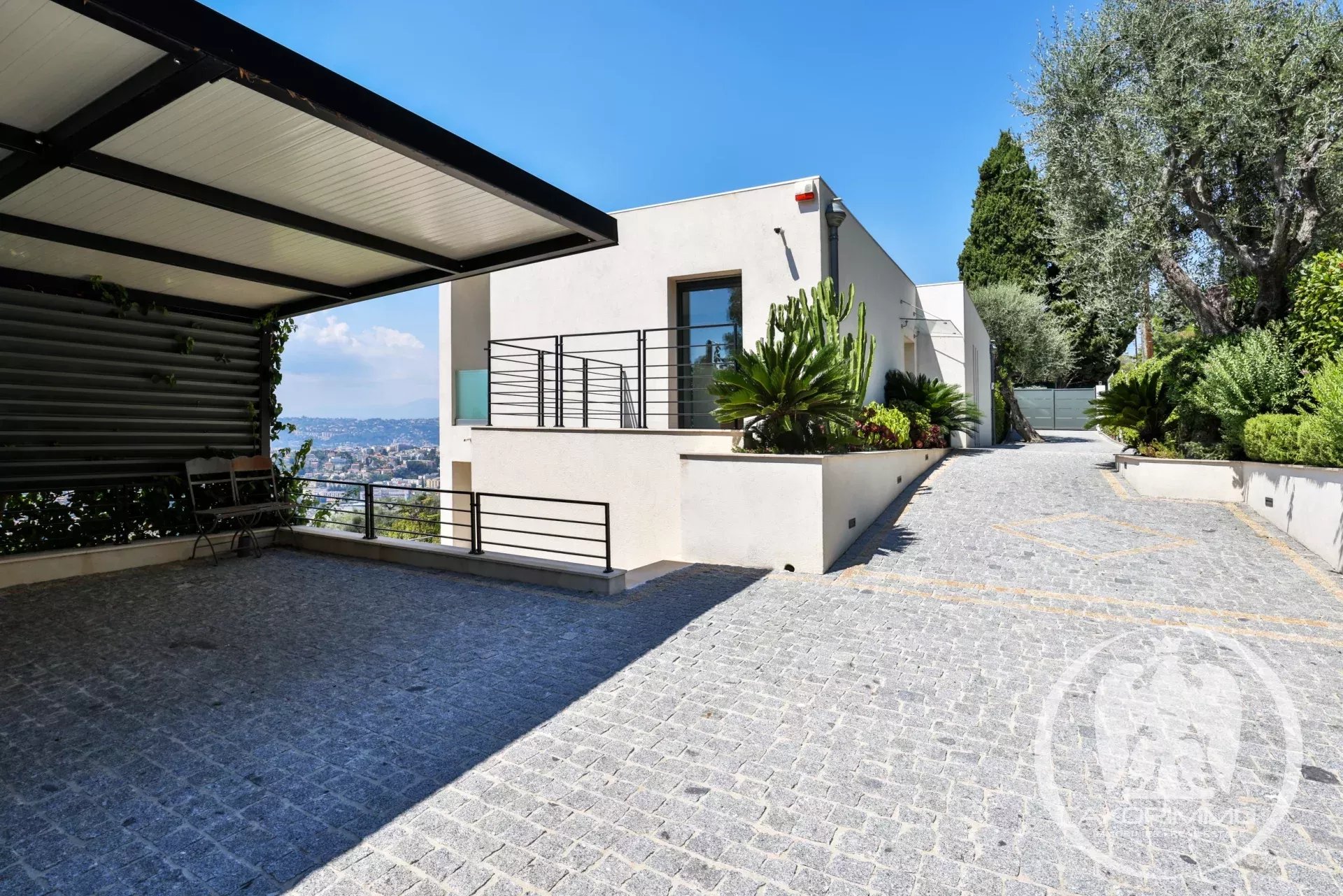 NICE Grande Corniche/Vinaigrier : Edifiée sur un terrain arboré de 1700 m², superbe villa rénovée aux prestations luxueuses. Cette propriété jouit d'une très belle vue panoramique sur la baie des anges et bénéficie d'une piscine chauffée à débordement avec poolhouse et d'un boulodrome.