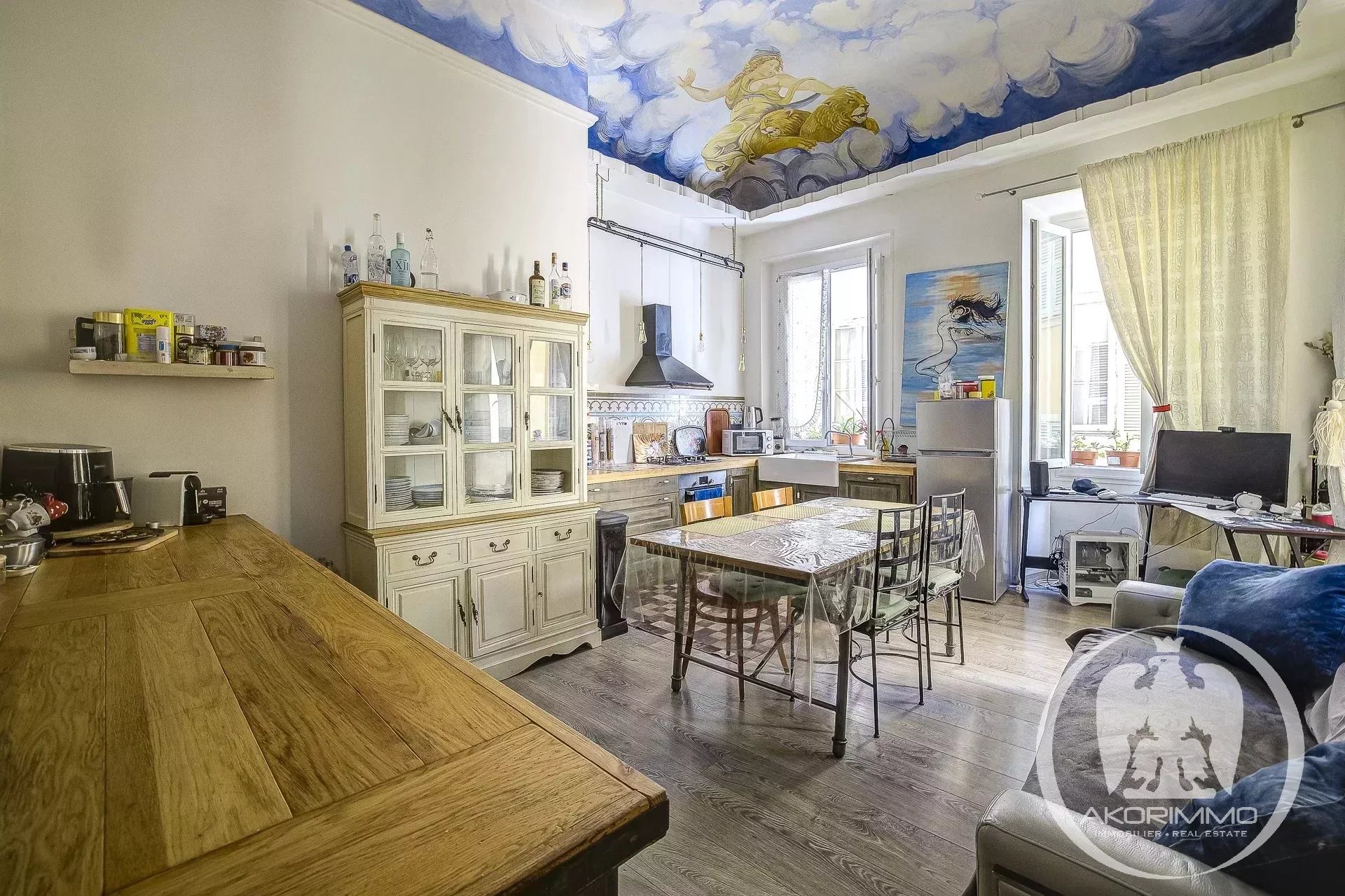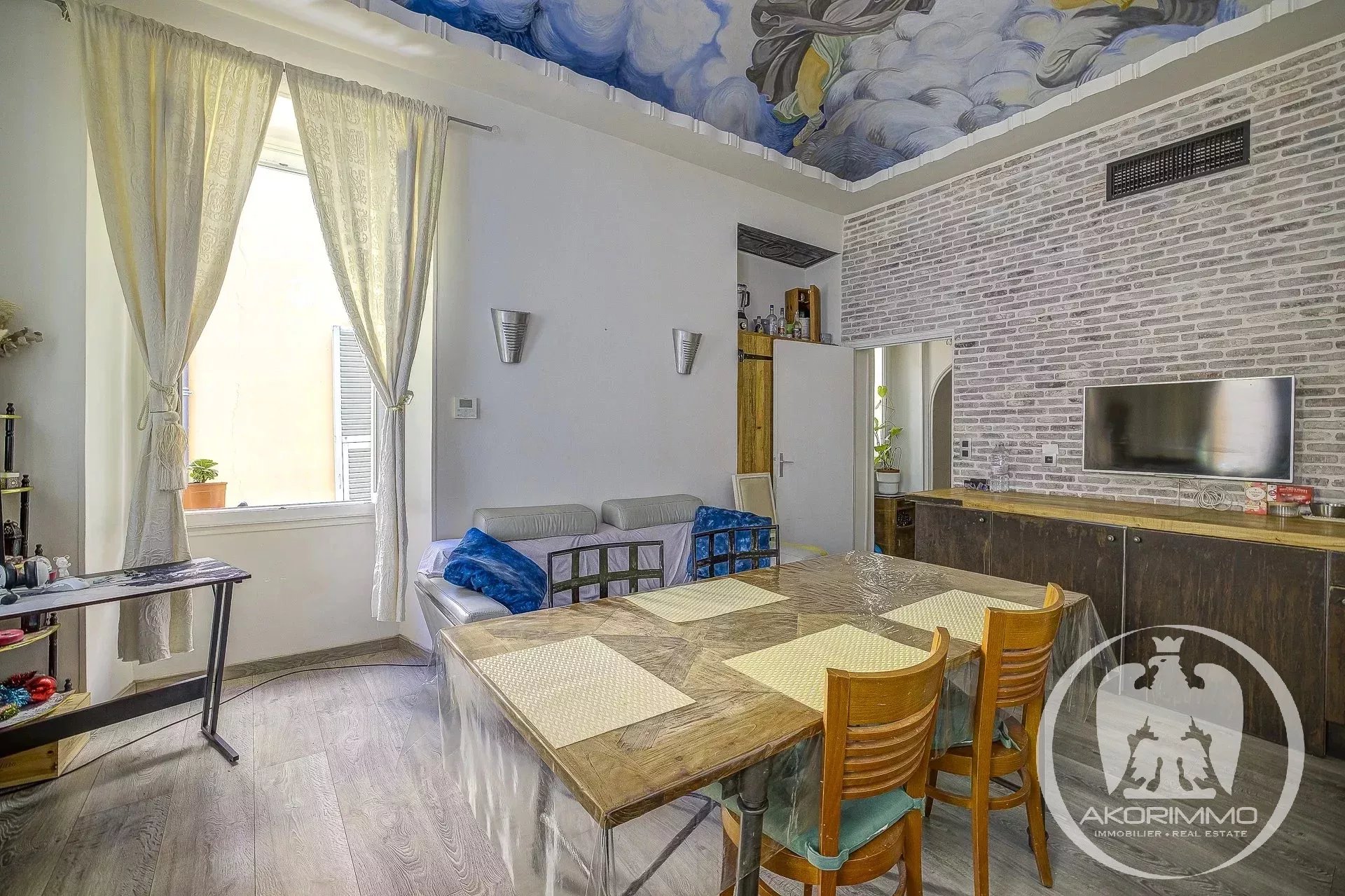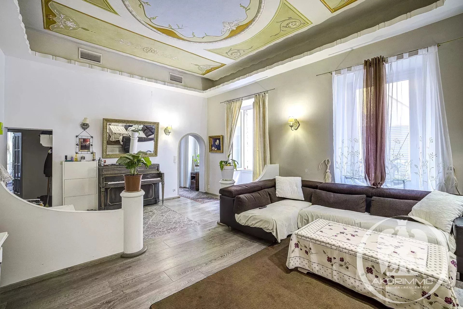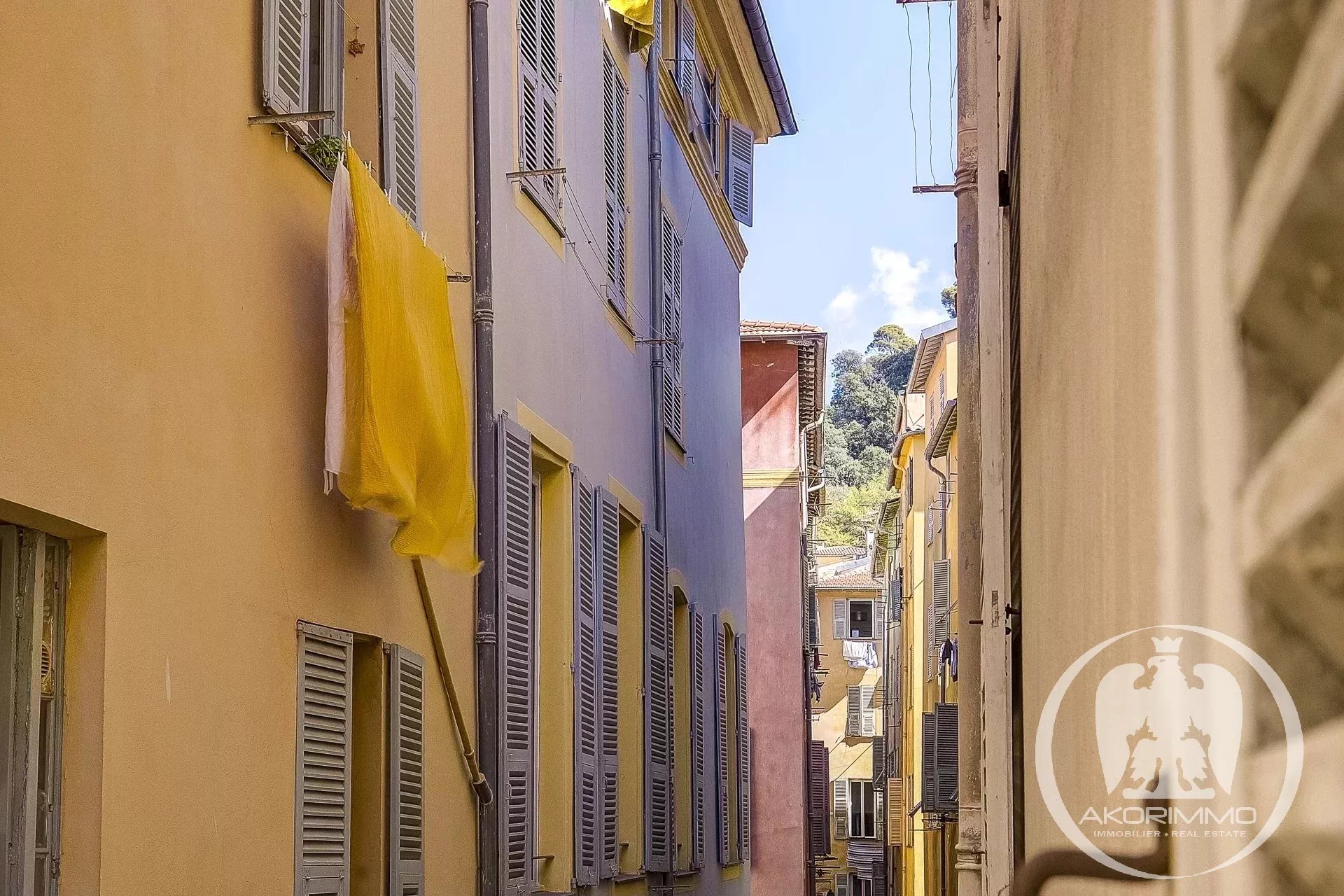 4 Pièces en duplex Vieux Nice A deux pas de la mer, bel ancien entretenu, 2° et 1° étage composé d'un séjour, d'une vaste cuisine d'angle, d'une chambre de maître avec salle d'eau en suite, à l'étage du dessous, 2 chambres et une salle d'eau avec W.C. Plafonds hauts peints et moulurés- double vitrage, climatisation sous gaine Copropriété 2880 euros/mois- commission vendeur